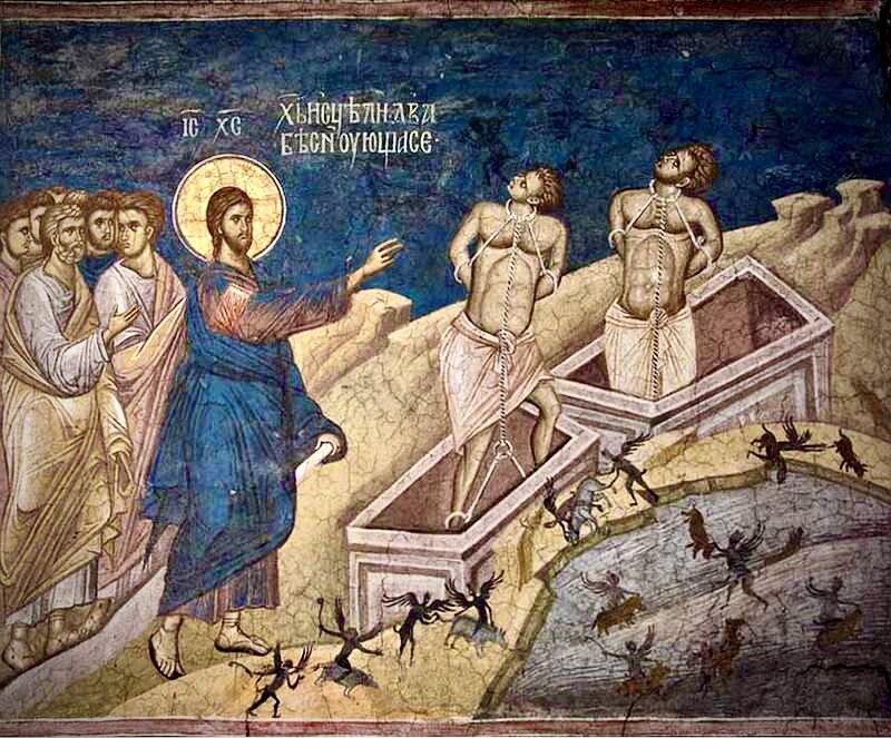 В пятое воскресенье по Пятидесятнице во всех храмах за Божественной литургией читается отрывок из Евангелия от Матфея, где говорится об исцелении двух бесноватых (Мф. 8:28-9:1) (храм Святого Князя Владимира - в 06.30 и 09.00) Речь идет о людях, которые стали полностью подвержены демонической воле и утратили образ человека. Они жили в гробах и были настолько страшны для всех, что многие старались обходить это место, зная об этих лютых человекоподобных существах, хотя безусловно это были люди. Господь показывает нам до чего доводит человека жизнь без Бога, к чему может прийти создание Божье, венец творений божественных - человек, созданный по Его образу и подобию, если он не будет стремиться сохранить в себе это богоподобие. Мало что известно о жизни этих двух бесноватых в земле Гергесинской, страшных своим гневом и немотивированной злобой. Евангелие показывает нам, что никакая сила человеческая не смогла связать этих людей, удержать эту демоническую силу в них. А из Евангелия от
