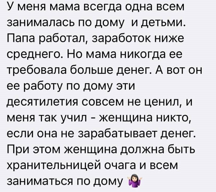 В комментариях подняли важную тему. Раньше такая ситуация в семьях (особенно советских) была очень распространена. К сожалению, у наших родителей не было таких возможностей, как у нас. На это повлияли в том числе исторические события: послевоенное советское время, перестройка, 90-е годы – в эти времена мужчины ценились не столько за свои качества, сколько сами по себе, просто фактом своего существования. Чтобы просто выжить в эти времена, женщины держались за мужчин, многое терпели в отношениях, говорили: «Мужик в доме есть и ладно, и так мужиков мало». Мужчина был нужен в доме, чтобы защитить в неспокойные времена, помогать по хозяйству, иметь общий бюджет, так как на одну зарплату сложно было выжить. А что пил/бил/изменял, так это «Все так живут». Сейчас времена изменились, но все-таки модель отношений наших родителей сильно влияет на нас. Например, если девочка с детства наблюдала, что отец не уважал и не ценил маму, или что она и по дому работала и деньги зарабатывала на двух раб