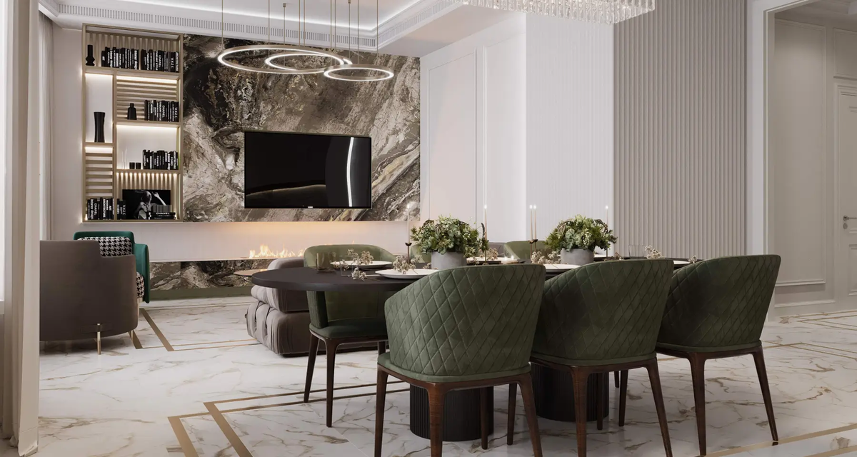 Интерьер четырехкомнатной квартиры 146 м² в ЖК «Резиденция Архитекторов», оформлен нашими дизайнерами в стиле арт-деко с белой основой (мрамор) и сочными акцентами, геометрическими деталями, зеркалами, хрусталем и золотистыми элементами (светильники, аксессуары). Все это дает отсылку к эпохе «Великого Гэтсби», добавляет обстановке изысканности и сдержанной роскоши.