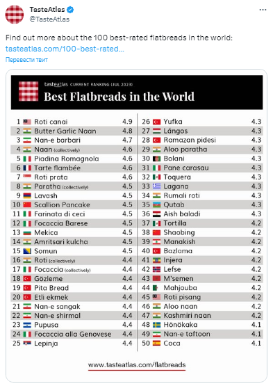 Армянский лаваш вошел в топ-10 лучших хлебов мира, заняв 9-е место, по версии кулинарного путеводителя TasteAtlas. Рейтинг опубликован на странице TasteAtlas в Twitter. Ранее, армянский лаваш в 2014 году был включен в список нематериального наследия ЮНЕСКО. Также, в 2022 году Армения заняла 90-е место (3,80 балла) в рейтинге лучших мировых кухонь мира по версии TasteAtlas.