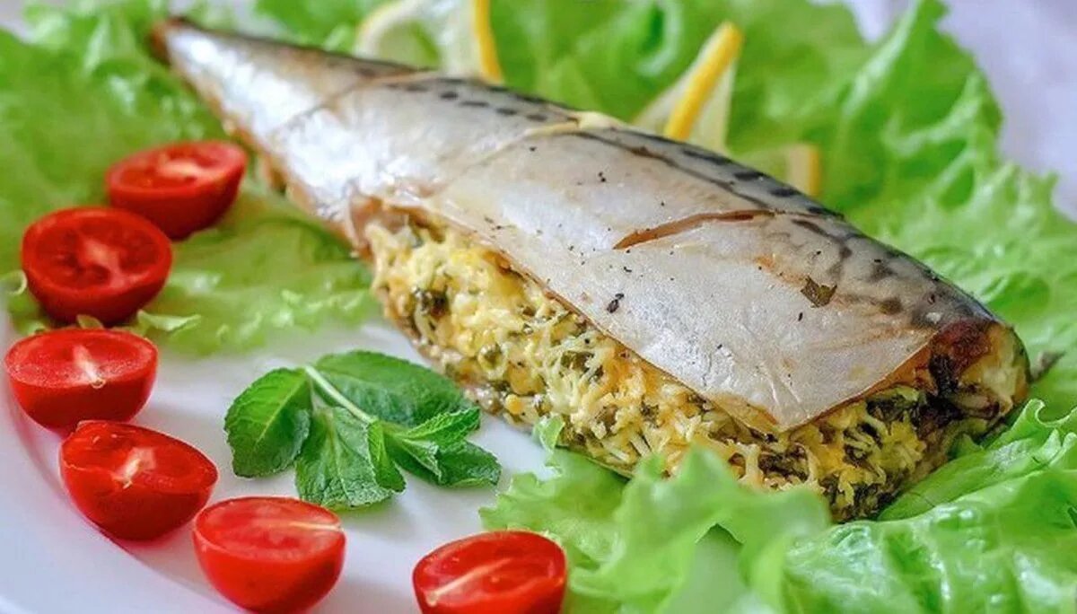 Люблю скумбрию, она у меня в тройке любимых рыб. О блюдах из скумбрии можно очень много говорить, а главное готовить. Со скумбрией я опубликовала достаточно много вкусных рецептов. Вот еще один. Попробуйте и оцените. Кто любит рыбу, можно готовить такую хоть каждый день. Готовится фаршированная скумбрия очень быстро. На ее приготовление уходит 45-50 минут. Запах рыбы с тарелок и вилок можно удалить, вымыв их сначала водой с мылом, а затем протерев лимонной коркой или уксусом. После этого посуду надо снова сполоснуть водой. Приготовление: 1. У скумбрии удалить внутренности через брюшко. Промыть рыбу. Сделать 3-4 разреза на поверхности рыбы с двух сторон. 2. Посолить и полить соком лимона, натереть приправой для рыбы(по желанию). Есть специальная приправа для рыбы, а можно просто солью и черным перцем. 3. Начинка: вареные яйца очистить и натереть на мелкой тёрке.Сыр натереть на мелкой тёрке и добавить к яйцам. Укроп вымыть и мелко нарезать. Чеснок очистить и пропустить через пресс. Доб