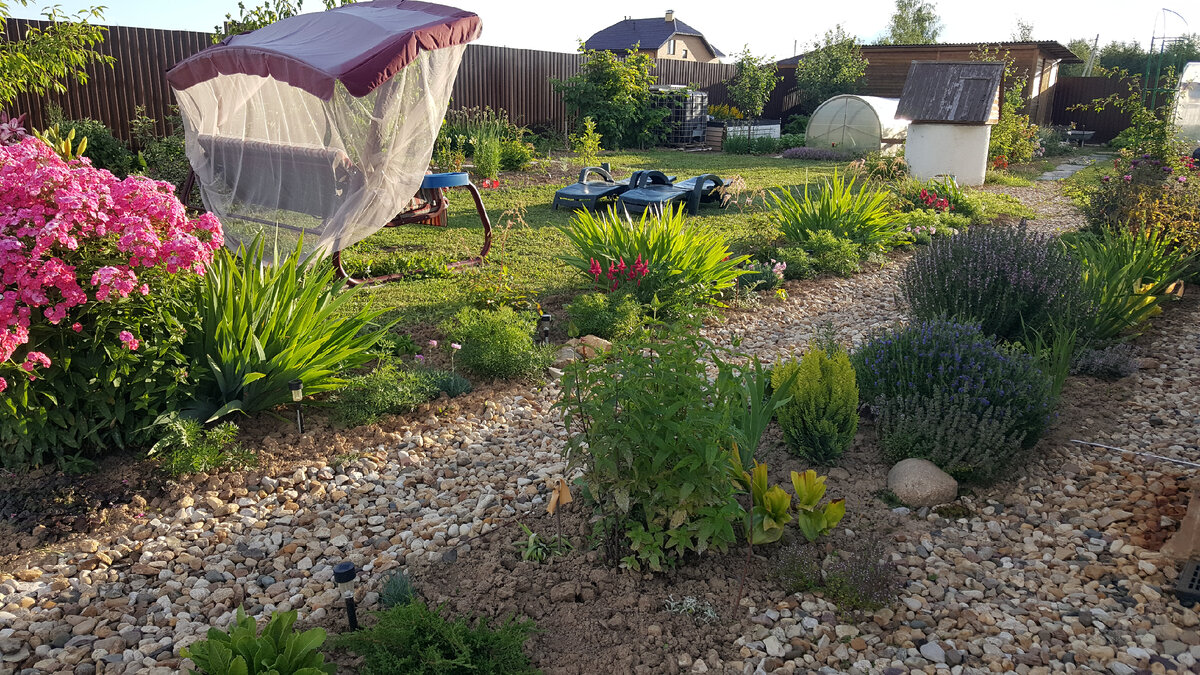 Солнечный микс - это неширокий цветник вдоль южной стены дома. Благодаря своему расположению он весь день освещен солнцем, поэтому здесь собраны светолюбивые и устойчивые к засухе растения (за редким исключением). О создании цветника я рассказывала в прошлом году: Чуть больше месяца назад я рассказала о том, как я "подружила" Солнечный микс с расположенным по другую сторону дорожки Неирисовым бордюром: Предлагаю посмотреть, как выглядят эти два цветника в середине лета и как они изменились. Главной и неоспоримой звездой июля в Солнечном миксе является плетистая роза Excelsa. Она растет здесь второй сезон, и нынешнее цветение будет на порядок обильнее прошлогоднего. Зимой мне удалось сохранить довольно длинные плети-побеги, а в мае эти плети были подняты на опору. Жизненная сила куста поражает - он одновременно готовится зацвести сотнями мелких ярко-малиновых цветов, собранных в крупные кисти, и отращивает новые побеги, некоторые из которых уже достигли двух метров в длину! Верным спут