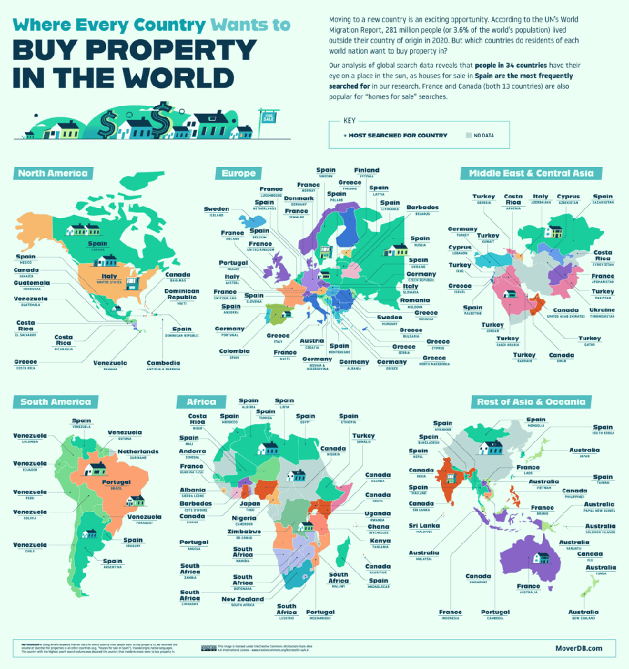 Жителей Южной Америки больше всего интересует Венесуэла. Граждан из стран Ближнего Востока и Центральной Азии привлекает Турция. Представители восточной и южной Европы чаще выбирают Грецию и Германию, а северной и западной предпочитают Францию. В Ниццу и Париж зачастую влечет и жителей Великобритании. Brexit усложнил реализацию этой мечты, но идея быть «немного более европейским», заключая выгодную сделку по недвижимости, остается привлекательной для британцев и особенно для пенсионеров. Впрочем, представители Великобритании также ищут недвижимость и в других странах – аналитики насчитали 22 государства, от Ирландии до Китая, где проявился этот интерес.Каждый год 35 000 британцев покупают недвижимость за границей, несмотря на Brexit и Covid.