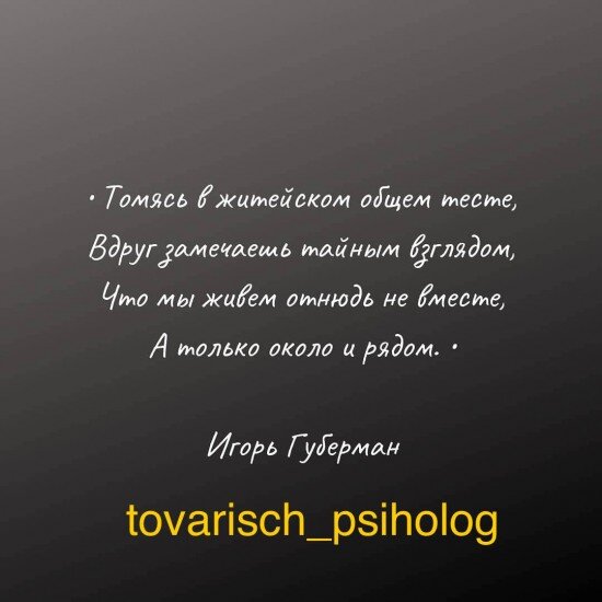 Как так получается, что два любящих человека приходят к тому, что живут не вместе , а рядом, как две планеты в параллельных галактиках. Ведь вначале хотелось узнавать, слышать, понимать... но потом всё это уходит. Взаимные обиды закрывают, блокируют желание слышать и познавать другого. Мы начинаем смотреть на близкого человека из своих проекций. И думать, что всё о нём знаем. Запомнила случай из времён своей юности. К моим родителям в гости пришла знакомая. Мой ныне покойный папа в беседе с ней говорит: " Ой, я с женой столько живу, уже всё о ней знаю". А знакомая: " Всё ли? Скажи, какой любимый цвет у Сони?" " Красный, - уверенно отвечает папа". А мама смеётся: " Да, я его терпеть не могу, а ты мне из поездок всё красное привозил". Эта ситуация мне запомнилась как напоминание о том, что человека всегда можно познавать и изучать. Если он, конечно, хочет нам открываться. Мы-то и себя не знаем, на что можем быть способны, что преодолевать, завоёвывать, терять... А уж о другом, даж