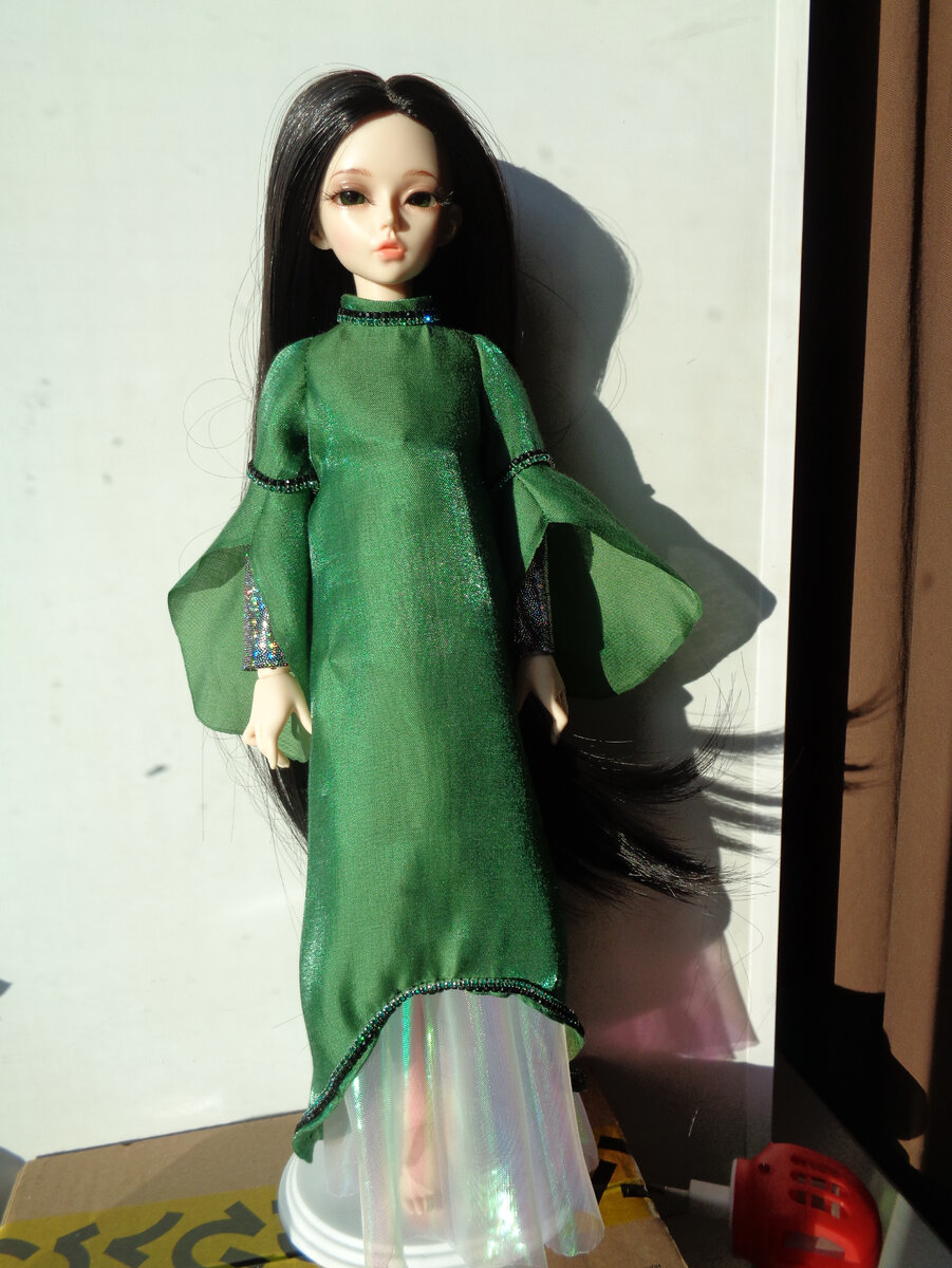Сегодня сразу два элемента одежды Хозяйки медной горы: нижняя и верхняя туники. Выкройки, в общем, те же, так что не прикладываю. Края ткани у нижнего платья обрабатывала паяльником. У туники длинные, до локтей, манжеты из "лазерной" ткани. Больше декора не делала никакого - ткань сама по себе декоративная, застегивается платье на кнопку. Верхняя туника с укороченным передом. Рукава удлиненные, в результате платье напоминает средневековое блио. Декорировала платье стразовыми цепочками с черными и изумрудными стразами. Думаю, нужно будет к нему обязательно сделать широкий шитый пояс - и из эстетических соображений, и из утилитарных. Дело в том, что ткань нижней туники оказалась достаточно жесткой, складки сложно уложить красиво, а пояс поможет это сделать.