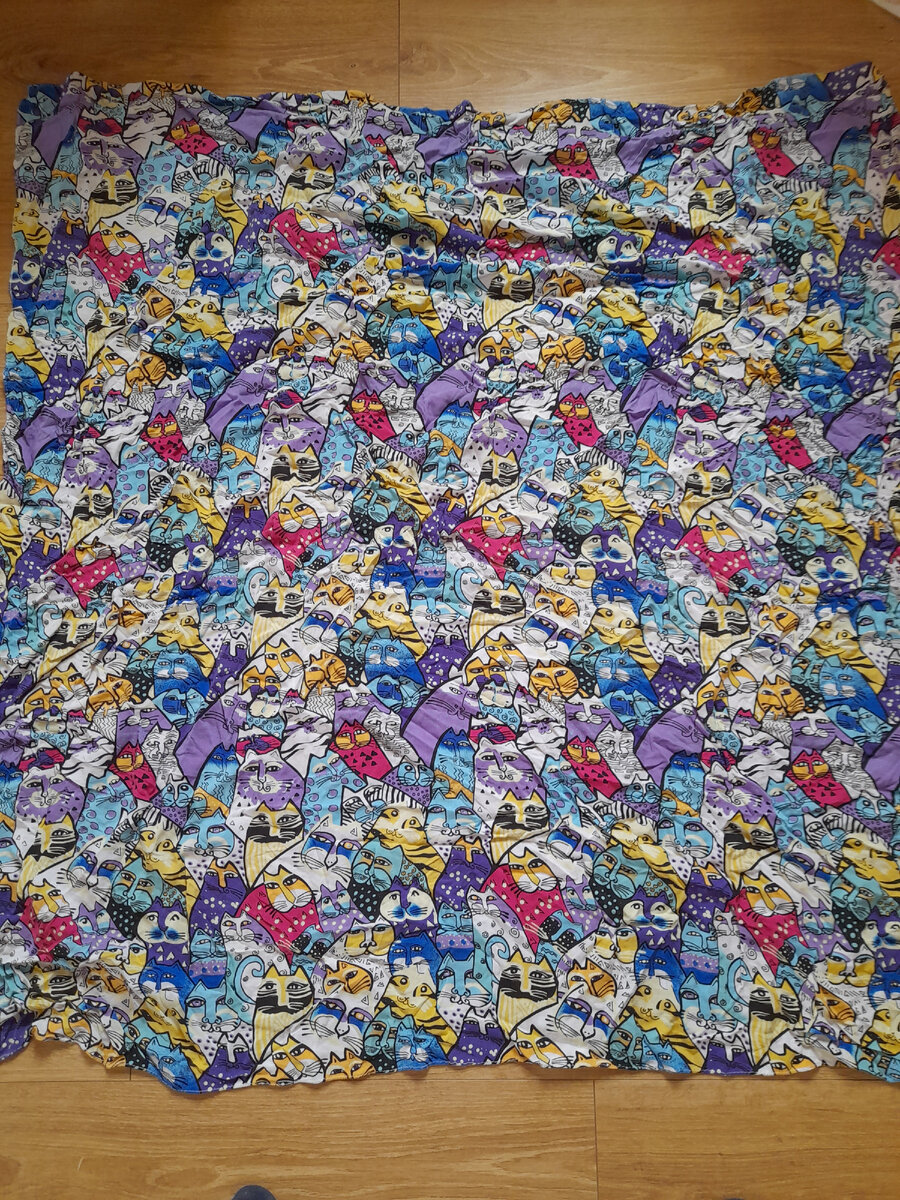 Шла на новый завоз с твердым намерением пробиться одной из первых к сумкам. Самое лучшее у нас растаскивают в первые минуты. Но в этот раз три стола были завалены дешевыми и сильно залюбленными сумками. Даже на максимальной скидке в четверг выбор был лучше. С обувью было немного получше. Хотя я давно ищу для себя босоножки, но никак не могу найти своего размера (34!). И тут меня привлекли платки и шарфы. На неделе вдруг вспомнила про котов (многие, наверное, видали платки и шарфы с принтом Петербуржские коты). У меня есть такой шелковый платок. Захотелось шарфик. Люблю я этих котов. Подхожу к столам (4 стола в два ряда, на которых навалено горой платки и шарфики), рядом женщина усердно просматривает чуть не каждый экземпляр и у меня на глазах вытаскивает чудесный экземпляр - цветастый платок с красивым принтом. Уже без особой надежды начинаю переворачивать гору за ней (а по другому найти что-то не получится) и сразу вытаскиваю два платка с котами. Это самый большой: Примерно 1х1 м. Хо