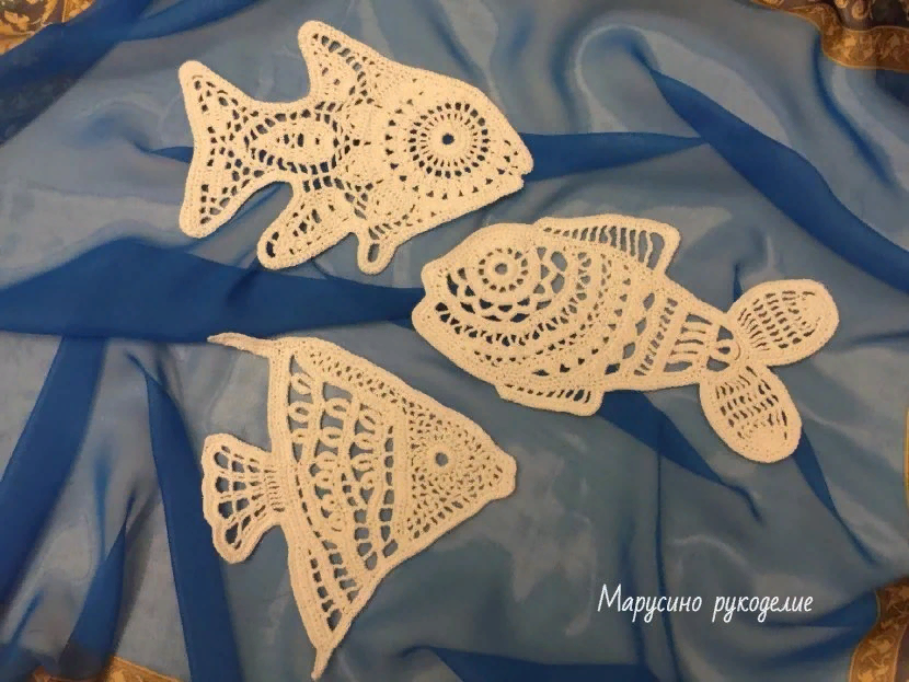 Из серии "Вязание для души". Хочу показать вам своих ажурных рыбок. Вот какие красавицы получились. Связаны они нитками «Пион», крючок № 1.25. Люблю я такие милые штучки. Зачем они? Просто понравились. Хотя... их можно использовать как декоративные салфеточки- подставочки в рыбный день :) Можно вставить в рамочку. Можно связать еще и объединить а скатерть. Или нашить на диванные подушки. Кому нравятся такие штучки придумают свой вариант применения. А я просто показываю вам идею. Рыбка просто красавица Рыбка скалярия Толстолобик получился. Рыбки вяжутся безотрывно. Процесс вязания является хорошей зарядкой для мозга при разборе (полетов) направления вязания! Вязать было очень интересно и увлекательно, как решение кроссворда. Сначала нужно продумать путь вязания как в лабиринте. А затем по нему пройти. Хорошая тренировка мышления и внимания. Это не то, что салфетки по кругу медитативно вязать. Вообщем, тренировала мозг с удовольствием. Схемы из журнала "Дуплет". Это авторские разрабо