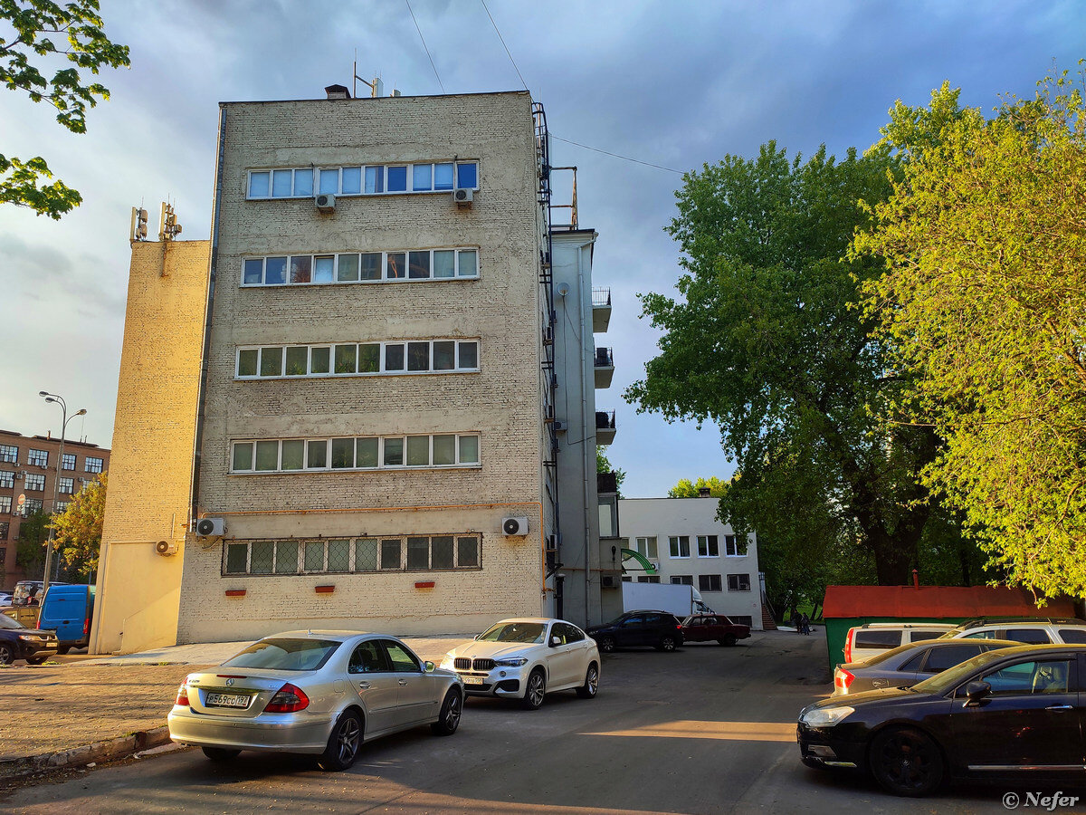 На проспекте Мира есть вот такое неприметное здание. Я обратила на него внимание благодаря соседнему корпусу с полукруглым выступом фасада. Ткнула в карту, отметила, стала изучать. Оказалось, это общежитие для работников ватной фабрики, рядом находится клуб. Комплекс построен по проекту архитектора Моисея Гинзбурга, автора знаменитого Дома Наркомфина. В здании общежития нынче располагается ветеринарная клиника, кальян-бар и множество мелких контор. Подъезд расположен со стороны проспекта Мира, зооклиника имеет отдельный вход. Ленточное остекление как бы намекает, что это конструктивизм, однако, проезжая мимо, я воспринимала этот дом не как жилой, а как техническую постройку. Рядом с жилым корпусом тот самый клуб. На самом деле общественный корпус, где размещалась столовая, прачечная и зал для собраний. Сейчас в этом корпусе располагаются магазин фейерверков, пиротехническая компания, компьютерная служба и типография. Комплекс построен в 1928-1931 годах. Объект культурного наследия. Гин