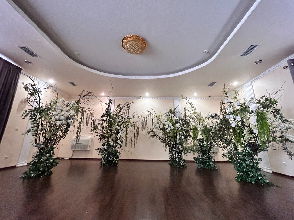 В моде природная стилистика. Современные декораторы предлагают обратить внимание на натуральные материалы из которых можно создать потрясающий по своей красоте декор для любых мероприятий. Такие элементы как шары, ткани и живые цветы постепенно уходят в прошлое, а их место занимают натуральные ветки, дикий камень, искусственные реалистичные цветы и стабилизированные растения. Оформление из таких материалов прослужит не один день, будет достойно смотреться на фотографиях и подчеркнет бережное отношение к природе. Акценты декора, которые отсылают к естественной красоте природы можно сделать следующим образом: 1. Фотозона всегда является важной частью любого события, так как фотографии быстро разлетаются по соцсетям и выступают в роли рекламы вашего мероприятия. Последний тренд — разнообразие растительных мотивов: листья, цветы, ветки, лианы, мох. 2. Оформление зала выглядит весьма оригинально, если с люстр будут спускаться ампельные растения, а стены украшать бархатистые панно из мха