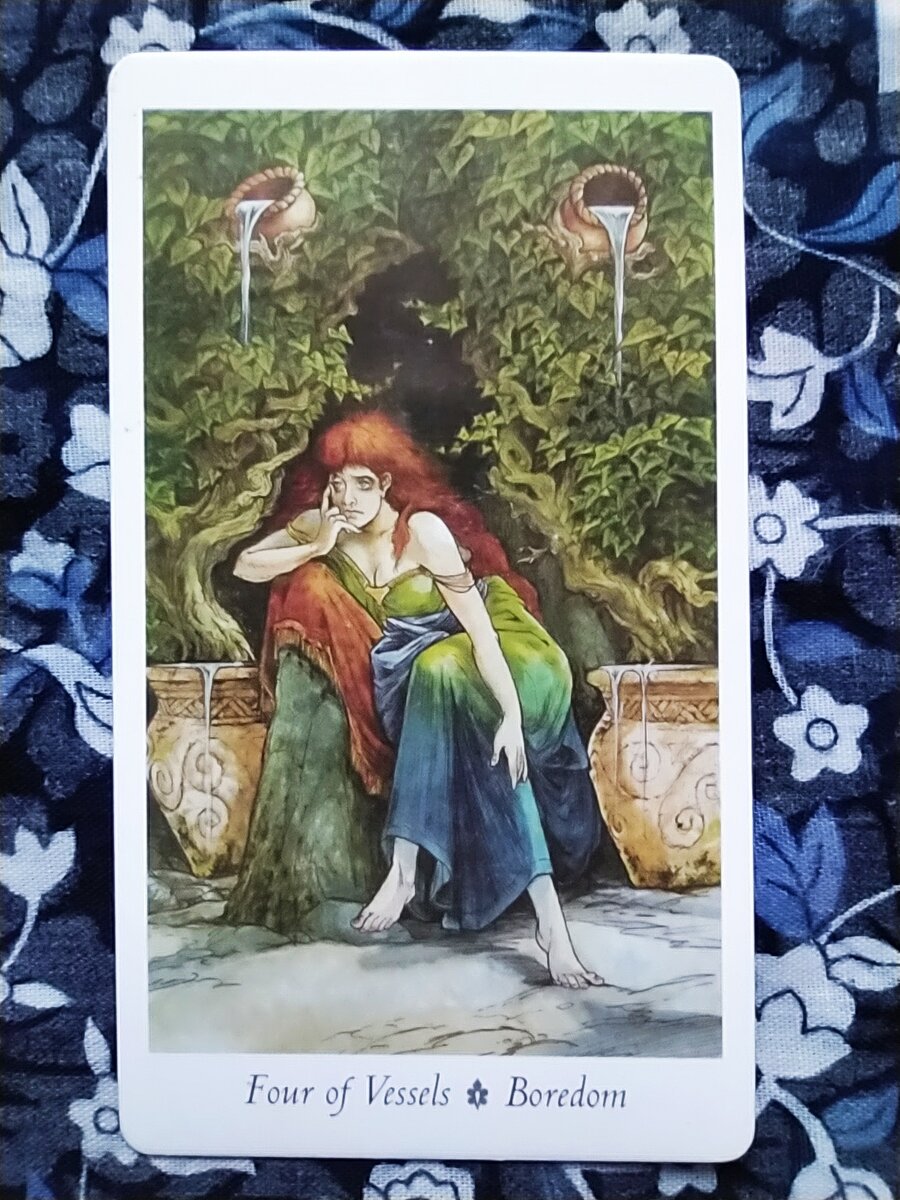 Доброго времени суток всем. В этом выпуске мы разберём значение карты на понедельник - 10 июля. А досталась нам Четвёрка Чаш. Также эта карта называется "Скука". На изображении мы видим сидящую девушку. Её поза говорит сама за себя, красноречиво подтверждая название карты. Вокруг неё плотная вязь растений создаёт глубокую тень, подчёркивая тягостное состояние. О чём может говорить нам эта картина? О том, что в этот день уместно будет экономить свою энергию. Если у вас есть возможность, отдыхайте. Если вам сегодня приходится работать, то берегите свои силы. Чем обычно характеризуется ощущение скуки? Как правило это переживание дискомфорта от недостатка впечатлений. Каким способом можно получить необходимые для полноценного восприятия жизни впечатления? Часто нам бывает скучно, если ничего не хочется, потому что мы не знаем, чего хотеть. В этой ситуации хорошим выходом будет "метод тыка". Интернет и библиотека для этого подходят идеально. Но, если такие варианты вас не устраивают, есть