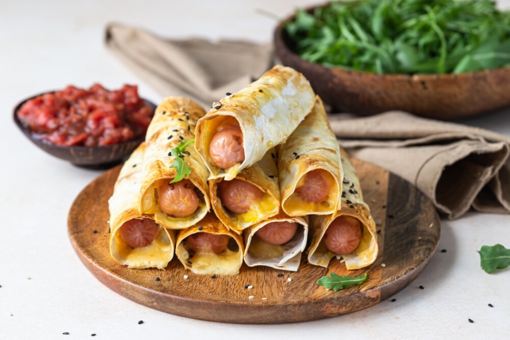 Как приготовить сосиски с сыром в лаваше Ингредиенты: Приготовление: Шаг 1 Шаг 2 Включить духовку разогреваться до 200 градусов. Лаваш кухонными ножницами порезать так, чтобы в получившиеся кусочки легко было заворачивать сосиски, и они не раскручивались в процессе приготовления. Яйцо разбить в миску и слегка взбить вилкой (миска нужна такого размера, чтобы в нее потом было удобно окунать кусочки лаваша с сосисками). С сосисок снять пленочку. Шаг 3 Сосиски выложить на сухую (без масла) хорошо разогретую сковороду и поджарить до красивой румяной корочки. Можно этот шаг пропустить, но так вкус готовых сосисок будет более выразительным и ярким. Шаг 4 На кусок лаваша выкладывать сначала тертый сыр, а потом с одного края положить сосиску и закрутить. Обмокнуть во взбитом яйце и посыпать при желании кунжутными семечками. Повторить, пока не закончатся продукты. Шаг 5 Выложить закрученные в лаваш сосиски на противень, застеленный бумагой для выпечки или силиконовым ковриком, и выпекать 10 мину