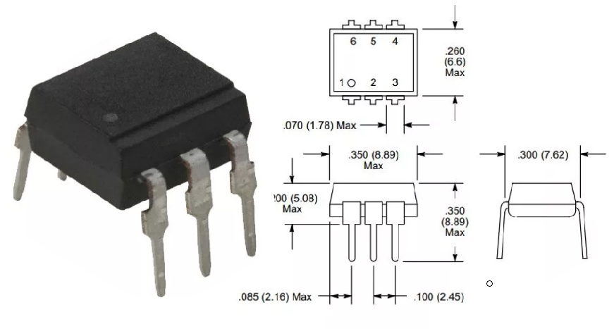 Оптопара с симисторным выходом. Выключение при нулевом напряжении на выходе. Технические характеристики: Коммутируемое напряжение: 115/240 В AC; Коммутируемое пиковое напряжение: 600 В; Выходной ток, пик.: 1 А; Минимальный ток включения: 5 мА Напряжение изоляции: 4170 В СКЗ, 1 мин; Рабочая температура: -40...+85 °C; Корпус: DIP, 6 выводов.