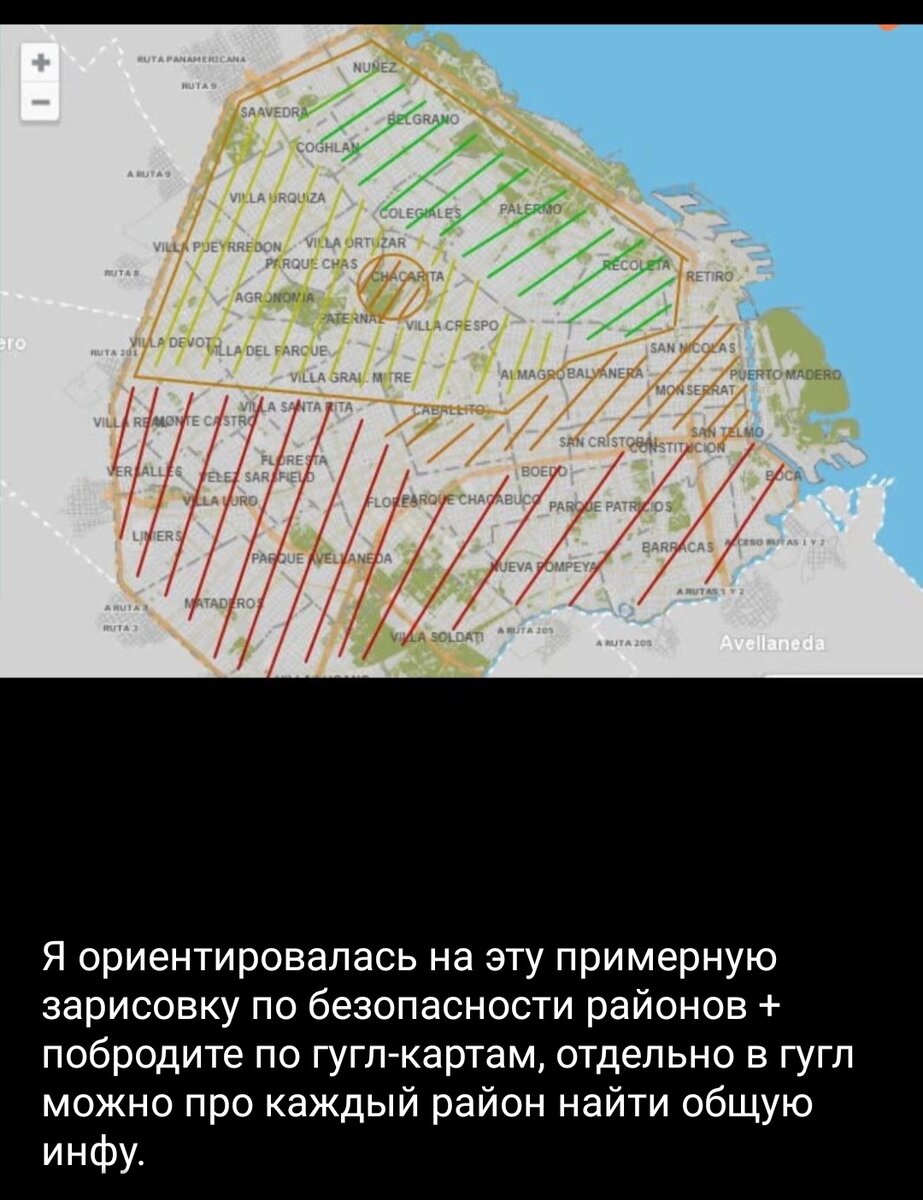 Жилье: изначально, мы взяли квартиру на airbnb на 3 недели, отмечу, что тк существуют санкции, то это был еще тот квест, ибо оплачивать нужно иностранной картой, необходимо пользоваться услугами друзей или каких-то частный компаний. Нам помогли друзья. Квартиры дорогие, за 500 евро мы получили маленькую квартиру, со средним ремонтом..... жить там было крайне неуютно. Кстати, здесь в домах ходят в обуви, поэтому как въезжаешь, то нужно убираться..... ибо квартира будет грязной. Важно также искать в хорошем районе, чтобы не жить в гетто и не остаться без телефона и денег. На фото карта с наиболее безопасными районами. В течении 3-х недель мы находились в активном поиске квартир, используя эти сайты: Местные сайты по аренде квартир: (краткосрочная аренда по ключевым словам: alquiler temporal/temporario) https://inmuebles.mercadolibre.com.ar/alquiler-temporal https://www.argenprop.com https://www.zonaprop.com.ar https://www.atbuenosaires.com https://www.soloduenos.com https://ww