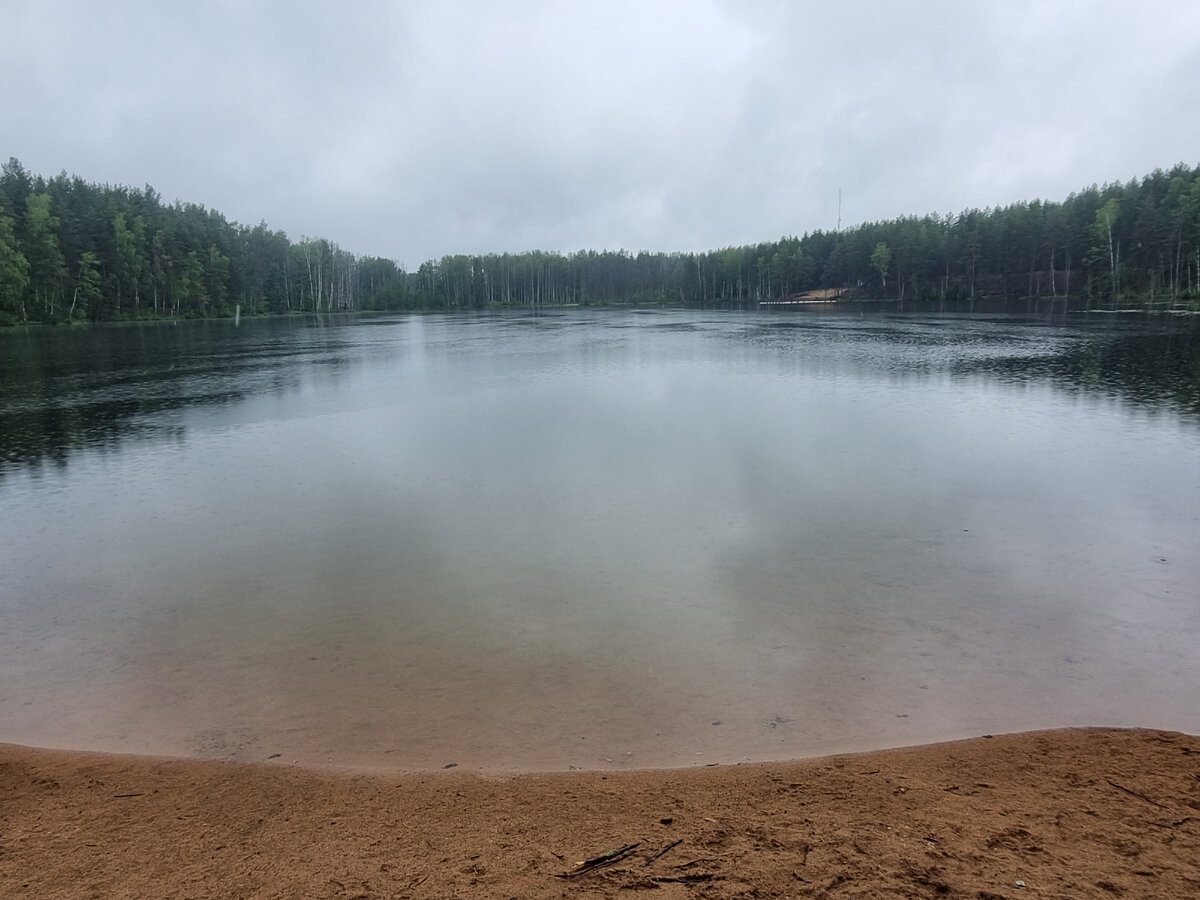 В том июльском походе мы побывали на семи озёрах, купались, поедали ягоды и радовались первым грибам. Хоть прогноз и не предвещал ничего хорошего, поход решили не отменять. Дождливая погода, конечно, менее комфортная, но и в ней есть свои прелести. Озера Марченково и малое Марченково. До большого озера от автобусной остановки идти 10 минут (приехали мы из Рощино на 125 автобусе). В хорошую погоду народу здесь отдыхает много, подъезд удобный, несколько песчаных пляжей, а главное вода чистая, прозрачная. В дождь на озере никого не было. Вокруг великолепный марченковский лес. Неподалёку от большого, через несколько сопок Малое Марченково озеро. Оно находится в котловине. Часть озера заболочена. Омытая дождем листва приобрела более яркие оттенки. Мы невольно восхищаемся разнообразием оттенков. Наблюдаем как дождинки расходятся по водной поверхности, рисуя круги. На хвоинках накапливаются капельки… Мы никуда не торопимся, можно остановиться и наблюдать за происходящим. Вокруг упоительный