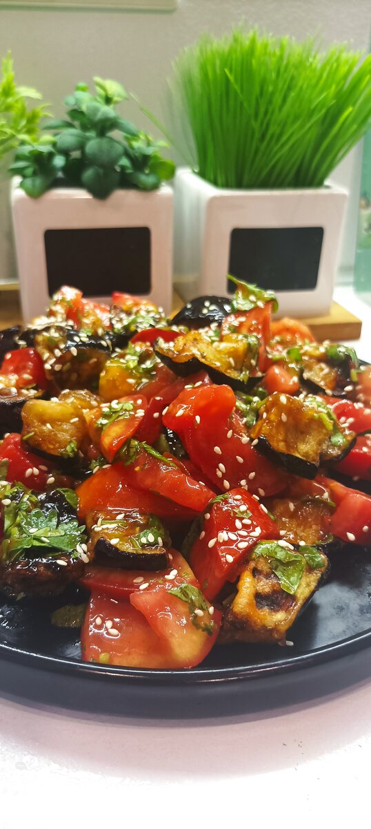 Добрый день, друзья. Предлагаю приготовить теплый салатик с хрустящими баклажанами. Это летнее блюдо станет полноценным обедом или ужином для вашей семьи. Ингредиенты: Приготовление: Баклажаны нарезаем крупным кубиком. Хорошенько солим. И даём постоять 25-30 минут. За это время они отдадут всю горечь и сок. Через 30 минут промываем баклажаны под проточной водой, немного отжимаем им даём обсохнуть. В любом случае, вы получите ХРУСТЯЩИЕ БАКЛАЖАНЫ. Смешиваем все ингредиенты и заправляем их кисло-сладким соусом. Сверху посыпаем кунжутом. Приятного аппетита! Вкусно и Красиво ♥️