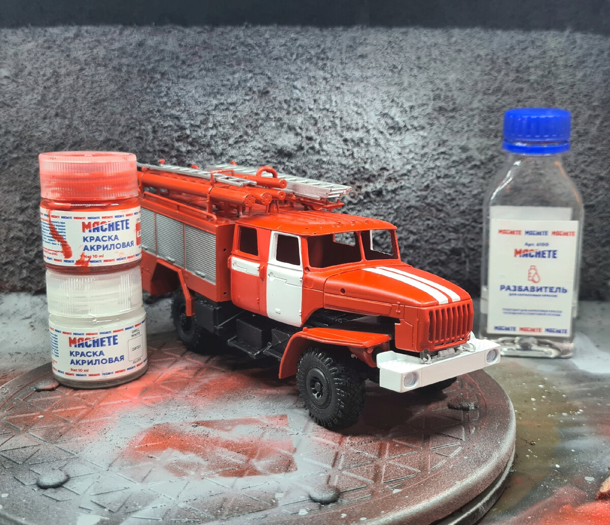 Судя по всему, костромичи решили проверить наши знания по химии. Пока они упорно писали, что новая краска сделана на основе акриловой дисперсии, я при помощи новых красок покрасила пожарный Урал. Мое чутье подсказывало, что это именно спиртовой акрил, аналог Тамии или же сама Тамия. Но "знающие" люди, многие из которых не держали ни одной баночки с краской в руках спорили со мной. И вот момент истины скоро свершиться! Производитель подтвердил, что это спиртовой акрил и скорее всего сегодня выпустит об этом сообщение. По самой краске. Палитру скорее всего делали специально для автомобилей от AVD, на это как бы намекает Икарусный цвет, черный для шасси глянцевый и шинный черный матовый. Но я пока успела попробовать огненный красный, белый и черный. Три цвета имеют приятный глянцевый блеск, который как раз нужен для моделей грузовиков в 43 масштабе. В целом, то что надо для пожарных машин. Водным акрилом такой блеск без лаков получить сложно. Еще в палитре есть светло-голубой цвет с явн