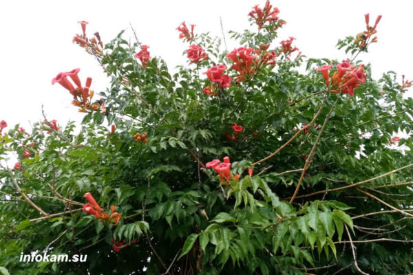 Родиной кампсиса является Северная Америка, однако и наших краях оно показывают устойчивость не только к зимним морозам, но и к городским условиям: дымо- и газостойкость. К слову, кампсис способен «взбираться» на высоту более 10 метров. В Камышине, правда, около 3-4 метров. Хотя, возможно, просто не было более высокой подпорной стенки.