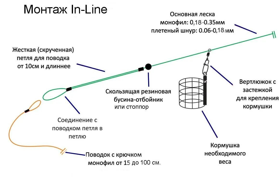 Инлайн часто используют спортсмены, так как оснастка безопасна для рыбы. Но так ли её любят любители? Не уверен, хотя монтаж действительно хорош. 🎣 Самоподсечка при использовании инлайна не так вероятна как при ловле патерностером, но чувствительность выше. Разберёмся как вязать инлайн. Что нужно⬇ ◽1 метр монофильной лески диаметром от 0,25-0,35 мм (в зависимости от веса кормушки); ◽ стопорки; ◽ вертлюг с застёжкой; ◽ кормушка. Процесс изготовления (фото схемы монтажа внизу)⤵ ⃣ Делим метровый отрезок лески пополам и вяжем петельку узлом «восьмёрка». К ней будем крепить поводок с крючком; ⃣ Чтобы оснастка не путалась, нужно сделать отрезок со скруткой выше сделанной ранее петельки☝ Одеваем петельку на палец и начинаем скручивание. ⃣Скрутку делаем 10-12 см. Скрутку в конце нужно зафиксировать с помощью той же «восьмёрки»; ⃣ После фиксации скрутки у вас будут два одинаковых куска лески и один из них нужно отрезать. ⃣ Далее одеваем резиновый стопорок и опускаем его до узла, ко