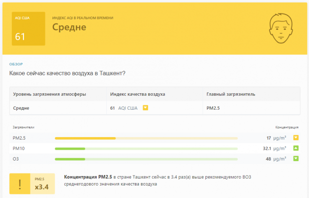 Зарегистрированное значение указывает на значительное нарушение руководящих принципов по качеству воздуха, установленных Всемирной организацией здравоохранения (ВОЗ), в частности, в отношении концентрации мелкодисперсных частиц, известных как PM2,5. В 08:30 станция мониторинга в Ташкенте зарегистрировала концентрацию PM2,5, которая была в 3,4 раза выше рекомендованного ВОЗ среднегодового стандарта качества воздуха.