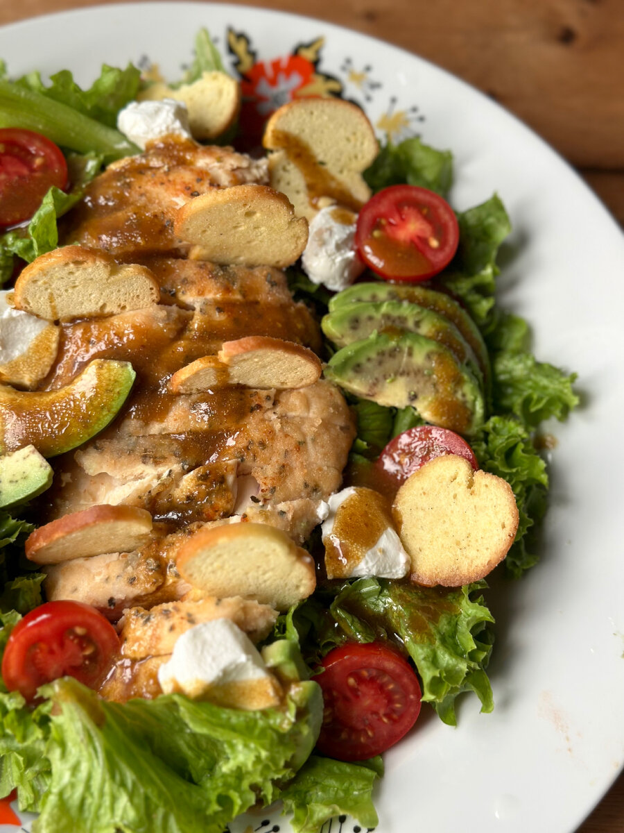 ✔️На листья салата выкладываем черри, авокадо, куриную грудку, шарики моцареллы, сухарики, поливаем заправкой. Готово!