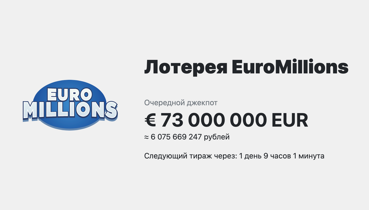 🔥 Очередной джекпот EuroMillions - €73 миллиона евро, или 6 миллиардов рублей! 🎱 В розыгрыше участвуют 50 обычных и 12 специальных шаров. 🎰 Нужно угадать 5 обычных и 2 специальных шара. Вероятность выиграть джекпот в EuroMillions составляет 1 к 139 миллионам. Разберем лотерею с точки зрения математики и статистики! Динамика изменения джекпота С 03.01.2018 года джекпот EuroMillions был разыгран 85 раз, в последний раз суперприз игры в размере €64 миллионов Евро был разыгран 21.06.2023. В среднем джекпот разыгрывается 1 раз в 23.1 дней. Статистика последнего тиража В последнем розыгрыше лотереи EuroMillions выпали шары под номерами 2, 11, 12, 19, 38, а также дополнительные шары под номерами 4 и 8. Сумма основных шаров составила 82, чётных номеров выпало 3, нечётных - 2, малых номеров выпало 4, больших - 1. Победители последнего розыгрыша В последнем тираже EuroMillions было 2 218 879 победителей, сумма призовых выплат на всех участников составила €11 215 217 Евро. Частота выпадения ос