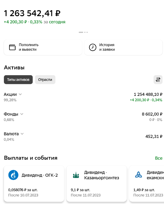 Сегодня получил зарплату и сразу часть денег отправил на свой брокерский счёт. Стараюсь стабильно, два раза в месяц совершать покупки дивидендных акций нашего фондового рынка. Уже 3 года и 5 месяцев я инвестирую и создаю капитал. 50 000 рублей я перевел на свой счёт у брокера СБЕР, таким образом общая стоимость моего портфеля достигла 1 263 543 рубля.