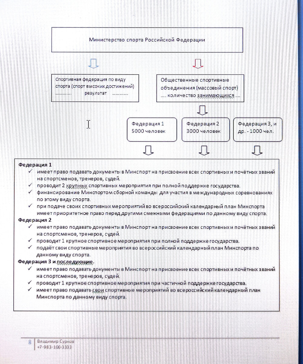Но если это новый вид, кто из чиновников берёт на себя ответственность утверждать, что именно эта, а не смежная общественная организация имеет право развивать этот вид спорта. И даже если всё справедливо и пальму первенства получила достойная федерация… А остальные тогда что, не имеют право на существование? А как же люди, которые идут именно этим путём, и хотят развивать именно это направление (и их поверьте, не мало). Неужели для них не найдётся возможности для самореализации и занятие любимым делом? Порой такие люди посветили не один десяток лет продвижению и развитию своего вида спорта. Опыт таких людей бесценен. И этот опыт государство может и должно использовать во благо граждан РФ. Разбрасывание такого рода ресурсов, я считаю не просто контрпродуктивно, но и вредоносно.