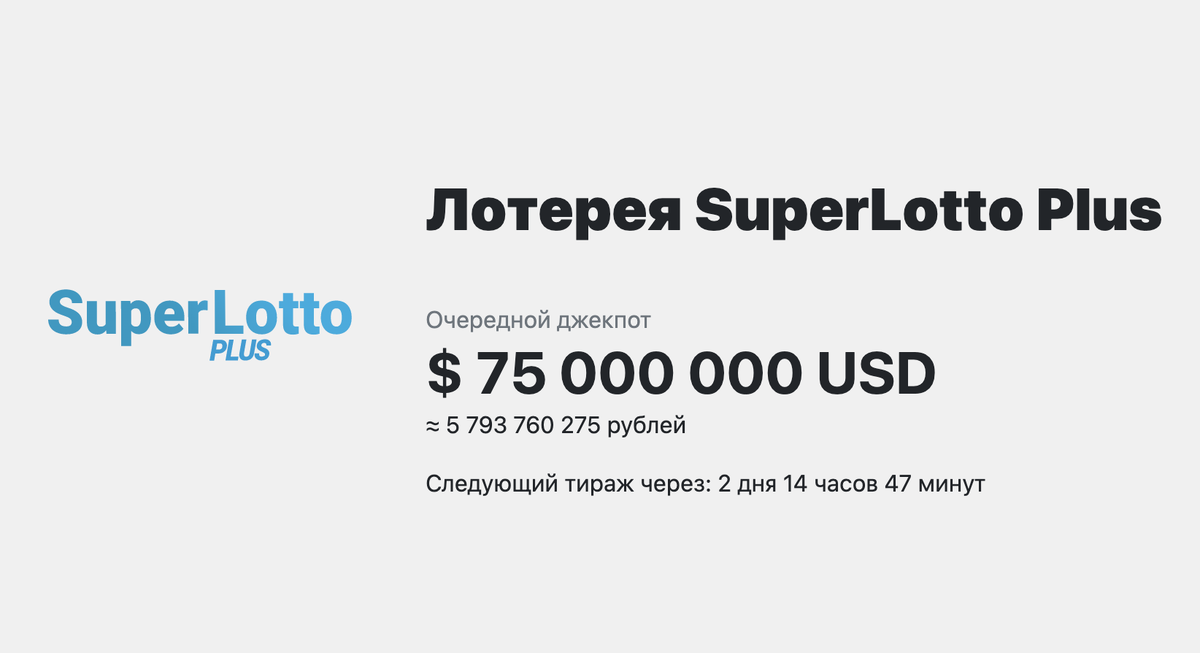 🔥 Джекпот SupperLottoPlus - $75 миллионов долларов, что по текущему курсу составляет почти 5.8 миллиарда рублей. Лотерея SuperLotto Plus проводится с 1986 года по четвергам и субботам в Сакраменто. Стартовый Джекпот лотереи составляет не менее $7 миллионов долларов США и при отсутствии победителя увеличивается с каждым новым розыгрышем еще как минимум на $1 миллион. 🎱 В розыгрыше участвуют 47 обычных и 27 специальных шаров. Чтобы выиграть джекпот нужно угадать 5 обычных и 1 специальный шар. 🎰 Вероятность выиграть джекпот в Powerball составляет 1 к 41 миллионам. Динамика изменения джекпота С 04.01.2018 года джекпот SuperLotto Plus был разыгран 27 раз, в последний раз суперприз игры в размере $41 миллионов долларов был разыгран 13.11.2022. В среднем джекпот разыгрывается 1 раз в 67 дней. Победители последнего розыгрыша В последнем тираже SuperLotto Plus было 151 865 победителей, сумма призовых выплат на всех участников составила $641 451 долларов США. Периодичность выпадения номеров З
