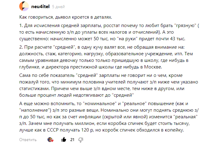 Министр озвучил среднюю зарплату учителя, и всё получается вроде как бы красиво. Не много ни мало, но как средняя зарплата по стране. А чем учителя лучше? Ну, не хватает вам ставки, берите две. Но как на них работать, в условиях тотального маразма, простите, школьного. Когда учителя занимаются всем, чем угодно, а детей учат попутно, если время останется и выкроят что-то. Читайте дальше и поймёте, почему у нас расходятся слова и дела. Обсудим)) Но сначала мнение про среднюю зарплату и объяснение того, что нам даст реальное повышение зарплат учителям. Мнение читателя под ником neu4itel. Надо ли повышать зарплату? Росстат научился играть цифрами, мы это понимаем. Так они и среднюю зарплату считают. Голубцы и капуста. Температура по больнице. В Москве больше 100 тысяч, а в глубинке, кому как повезёт, много составляющих. Главное, что ставки ниже МРОТа, но это никого не интересует. Мы же смотрим на средние цифры. Ну, а про то, что валят всё в одну кучу, это точно. Директор плюс молодой пед