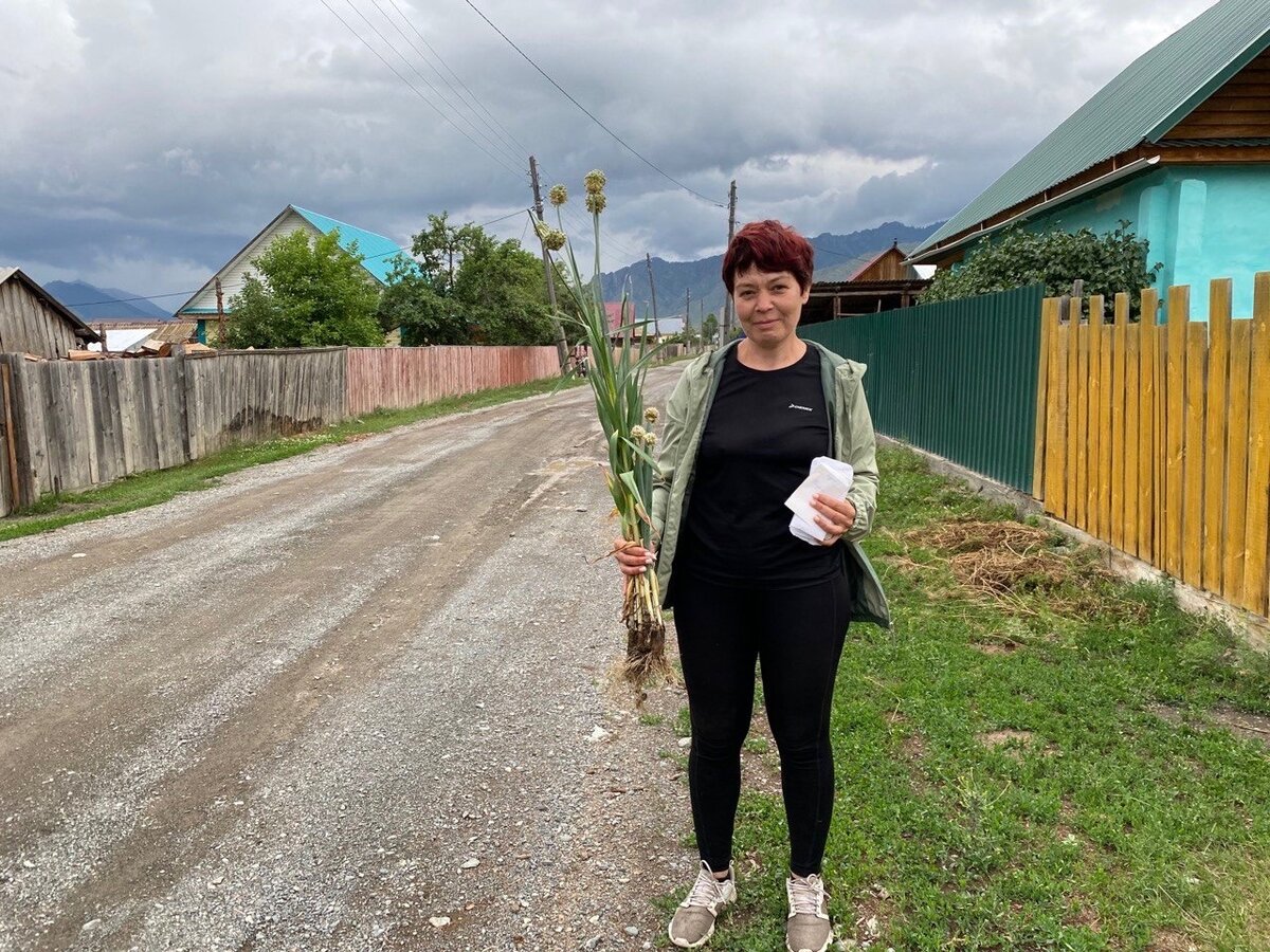 Подъехали к дому. Вся прилегающая территория засажена плодовыми деревьями, вишня, слива, яблоня, груша, а между ними пионы. Заходим и такое ощущение, что попал в эпоху Чеховского «Вишневого сада». Дверь в дом была закрыта, видимо отлучился, поговорить с ним не удалось. Хотелось расспросить его о судьбе плодового сада. Ведь на его территории, судя по записям дневников, были найдены образцы луков в скалистых расщелинах. Ну да ладно. Едем дальше, останавливаемся около усадьбы на краю села, которая привлекла нас своей ухоженностью и разнообразием культур на огороде. Хозяйка Елена встретила сначала настороженно. Сначала разговаривали через калитку. Постепенно взгляд её стал более открытым, улыбка появилась на лице и она даже пригласила к себе в огород. Все было ухоженно, прополото, полито и подвязано.