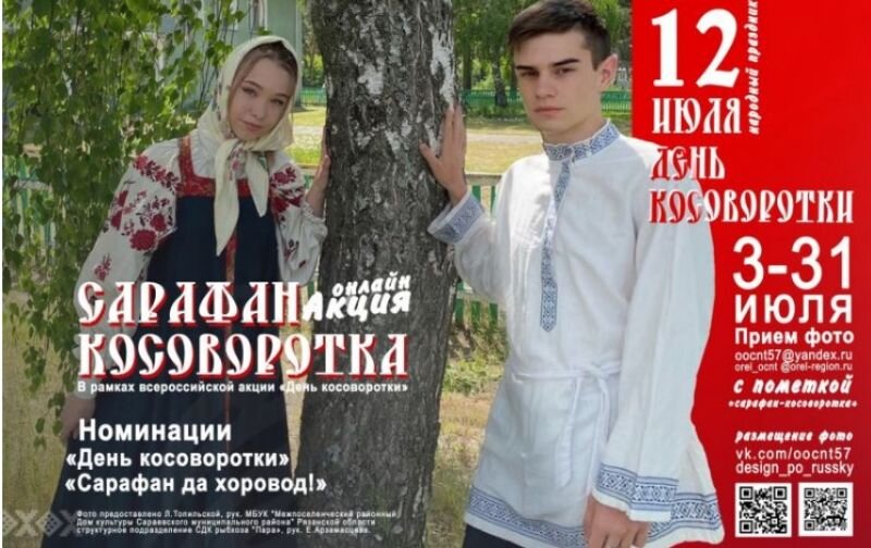 Орловский областной центр народного творчества приглашает желающих принять участие в фотоконкурсе "САРАФАН-КОСОВОРОТКА 2023", приурочненном к традиционному Дню косоворотки, отмечаемому 12 июля.