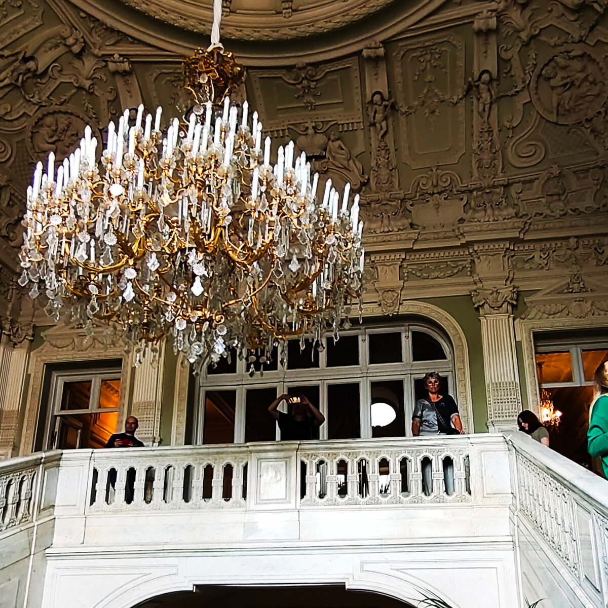 А рассматривать в этом дворце есть что. Ну первое, на что я обратила внимание, это люстры. Они здесь разные, каждая подобрана к своему дизайну. Но однозначно красивые, вот прямо все подряд. Круглые, квадратные, прямоугольные, или какой нибудь необычной формы. Все они притягивают взгляд. Далее идут лестницы. Вообще, лестницы во дворцах, это отдельная песня. Потому что и ковры на них лежат красивые, и перила точеные. Да и лестницы то еще не простые, а мраморные! Поэтому редко пройдешь мимо лестницы, не заглядишься на нее и не сфотографируешь. И в этом дворце лестницы заслуживают внимания, однозначно. Что дальше то у нас привлекает внимание? Однозначно потолки. А каких только потолков нет в этом дворце! И резные, и рисованные, и инкрустированные, да и слов у меня нет их все перечислить. Просто задрала голову, рассматривала и восхищалась. А как гармонично эти потолки дополняют интерьер этого дома, как хорошо вписываются в дизайнерскую идею! А ведь идее то лет двести! Ну а про стены то тож