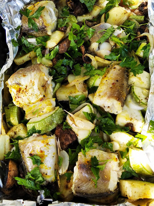 Часто запекаю мясо и рыбу с овощами. Сегодня в меню – хек. Вместе с ним - кабачки, грибы, лук, чеснок. Чищенного и вымытого хека разрезаем на фрагменты и маринуем в смеси для рыбы. Овощи маринуем в растительном или оливковом масле с солью и перцем. На противень выкладываем фольгу. Смазываем её маслом. На фольгу - овощи, сверху - кусочки хека. Сверху закрываем фольгой, и запекаем при 190* 20 минут. Потом при открытой фольге - ещё 10 минут. Приятного аппетита! От наших друзей: Даниил Крамер, джазовый и классический пианист, Народный артист России, на Радио Медиаметрикс Больше общения и рецептов - в группе "Рецепты для диабетиков" в ВКонтакте! Рецепт на странице Автор рецепта – Людмила Гурова