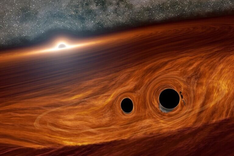 О расстоянии «до сингулярности» Некоторые ученые предполагают, что в центре черной дыры существует сингулярность — то есть области с бесконечной плотностью. Горизонтом событий называют «границу» черной дыры — ту область, куда что-то может попасть, но откуда ничто не может вырваться. Однако заметим, что сингулярности не наблюдаются непосредственно и при нынешнем уровне развития физики остаются лишь теоретическим построением. Вопрос выше звучит предельно интригующе, примерно как «кто сильнее — кит или слон?». Дело в том, что если мы поместим две черные дыры действительно рядом, то они неизбежно начнут сближаться до полного слияния. Такие события реально происходят, причем довольно часто. Поскольку подавляющее большинство черных дыр астрономам не видны, фиксировать такие слияния научились только семь лет назад, после появления достаточно чувствительного детектора гравиволн (LIGO). Гравитационные волны большой энергии возникают при слиянии двух черных дыр, или двух нейтронных звезд, или че