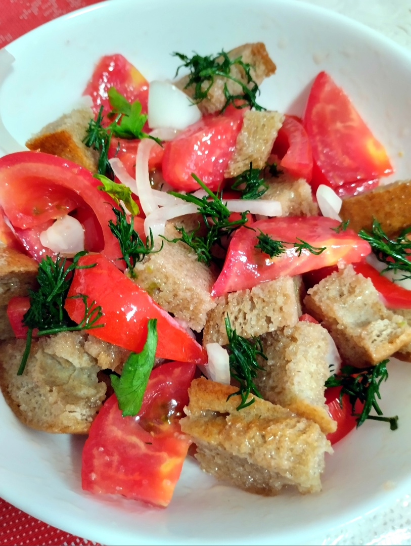 Очень простой салат, который можно приготовить буквально за 5 минут. Но я вам обещаю, что если вы его приготовите, он будет частым гостем на вашем столе. Салат очень ароматный, сочный! Отлично подойдет для быстрого перекуса, и даже заменит гарнир. Ингредиенты: Отрежьте щедрый ломоть ржаного хлеба и нарежьте его на кусочки. Хлеб может быть серым, бородинский, цельнозерновым и т. п. - на ваш вкусу. Только не рекомендую брать очень свежий, вчерашний - самое то! Посолите хлеб и полейте душистым маслом. Старшее поколение наверняка помнит этот божественный вкус! Когда выбегая на улицу, брали для перекуса не шоколадку, а кусок ржаного хлеба, щедро политый душистым растительным маслом и посыпанный солью. Нарежьте помидоры дольками и выложите на хлеб. Главное не промахнуться с помидорами - они должны быть спелыми, сладкими, вкусными. Мне повезло! Лук нарежьте кольцами или полукольцами и выложите на помидоры. Немного подсолите, полейте еще растительным маслом и перемешайте. По желанию можно доба