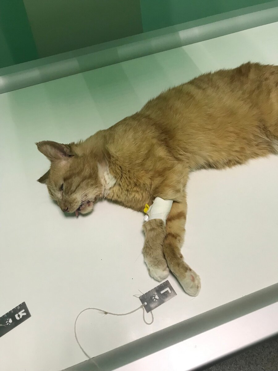 Попал Павлуша к нам несколько месяцев назад с огромным абсцессом. Лежал в траве худенький облезлый, как ненужная тряпочка. В соцсетях было несколько постов с фотографиями жалкого рыжего котика в траве, и мы конечно же решили ему помочь.