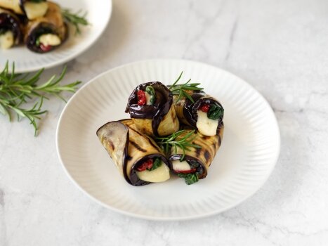 Как приготовить закуску из баклажан с вялеными томатами Ингредиенты: Приготовление: Шаг 1 Шаг 2 Промыть баклажаны, отрезать хвостики. Нарезать на тонкие слайсы толщиной 1-1,5 см каждый. Шаг 3 Посыпать солью слайсы баклажан, а затем немного помять руками. Чтобы ушла с солью горечь, и баклажаны немного просолились. Дать постоять баклажанам с солью 15-20 минут. Шаг 4 Промыть шпинат под проточной водой, чтобы смыть грязь и частички почвы. Оторвать стебельки от листьев. Шаг 5 Разогреть сковороду, добавить 1 чайную ложку растительного масла и нарезанный зубчик чеснока. Хорошо прогреть масло с чесноком. Шаг 6 Выложить листья шпината на разогретую поверхность сковороды и аккуратно перемешать. Шаг 7 Потушить листья шпината 2-3 минуты, как только шпинат потеряет в объёме, выключить. Добавить щепотку соли и сок дольки лимона. Шпинат полностью готов, можно перейти к следующему этапу. Шаг 8 Промыть слайсы баклажан от лишней соли, выложить на бумажное полотенце, чтобы ушла лишняя влага. Тем самым п