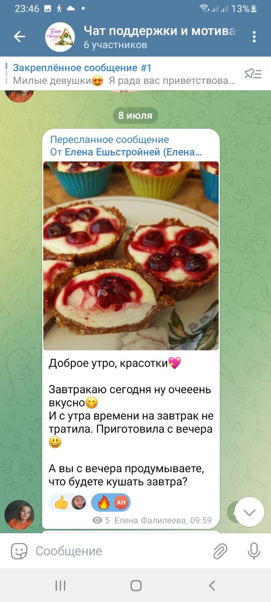 Друзья, всем доброй ночи! Приветствую вас на своем Дзен канале ЕшьСтройней, где я делюсь вкусными ПП рецептами с расчетом калорий и полезными советами. Я сама похудела на 27 килограмм, выучилась на нутрициолога и делюсь информацией с вами! Последние несколько дней мы вели активную подготовку нашего первого марафона ПП. Это маленький старт, который, мы уверены, обязательно приведет к большим победам! Марафон проходит под девизом "Учимся кушать много, вкусно, часто и худеем!" Сегодня первый день марафона и уже состоялись первые шаги - объемы замерены, тела взвешены, меню с вариантами замен выдано, продукты закуплены и первые коллажи с рационами тоже есть! Задор и активный настрой девочек радует, с таким активным подходом нам точно удастся прийти к успеху! Первая неделя марафона проходит бесплатно, и у всех желающих еще есть возможность присоединиться! P.S. Все девочки дали разрешение на публикацию материалов из чата) До новых встреч! ❗Всегда ваши ЕшьСтройней❗ Социальные сети
