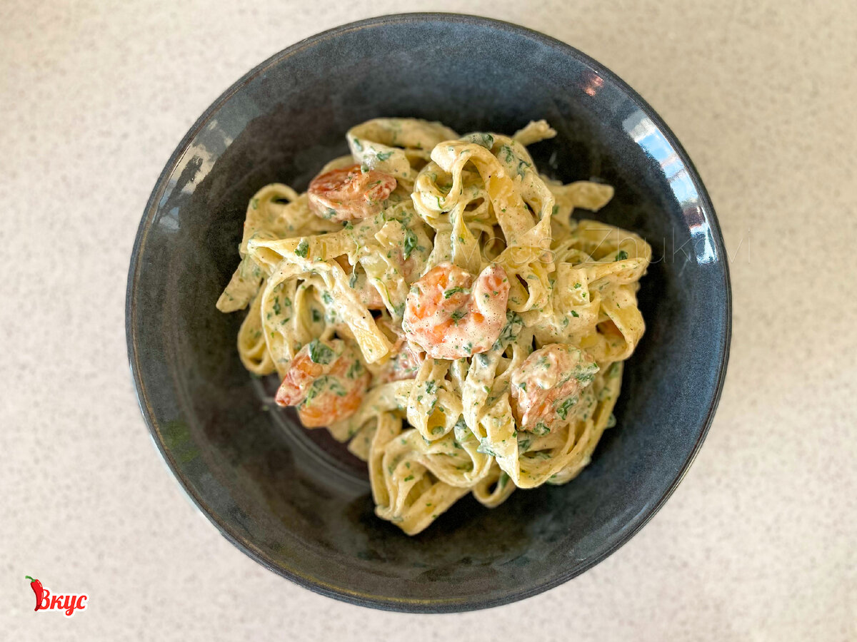 Вводим заранее отваренные фетучини, готовые креветки и перемешиваем. Томим под крышкой на слабом огне несколько минут.