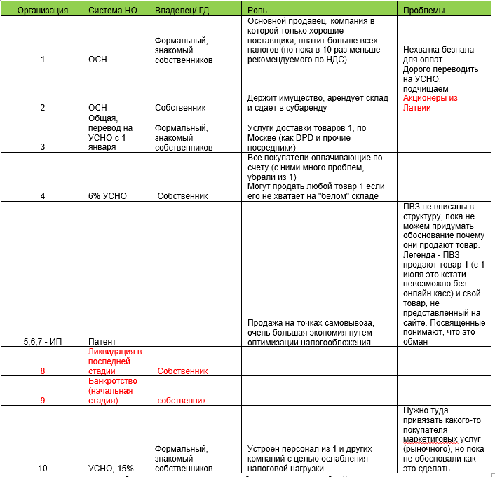 Также было 3 ИП, которые служили ТОЛЬКО для оптимизации налогообложения, при этом никакой красивой легенды для этого не было придумано. Это были несколько пунктов выдачи заказов, выручки у которых почти не было. Вся белая выручка подпадала под патент и особо не облагалась.