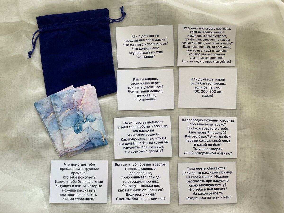 🗯 Я придумала 40 вопросов про образ мыслей человека, про его прошлое, настоящее и будущее. Ответы на вопросы с карточек дают возможность людям узнать много нового и интересного, а также почувствовать поле доверия, близости, принятия и любви. Человек рассказывая о себе, показывает свой внутренний мир, раскрывает то, что, может быть, никто и не знал до этого.