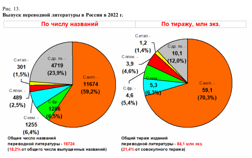 Минцифры сообщило, что на английский, французский и немецкий языки приходится более 70% переводной литературы. Так, в 2022 году издали 2 769 названий в переводе с русского языка общим тиражом 3,4 млн экз.
