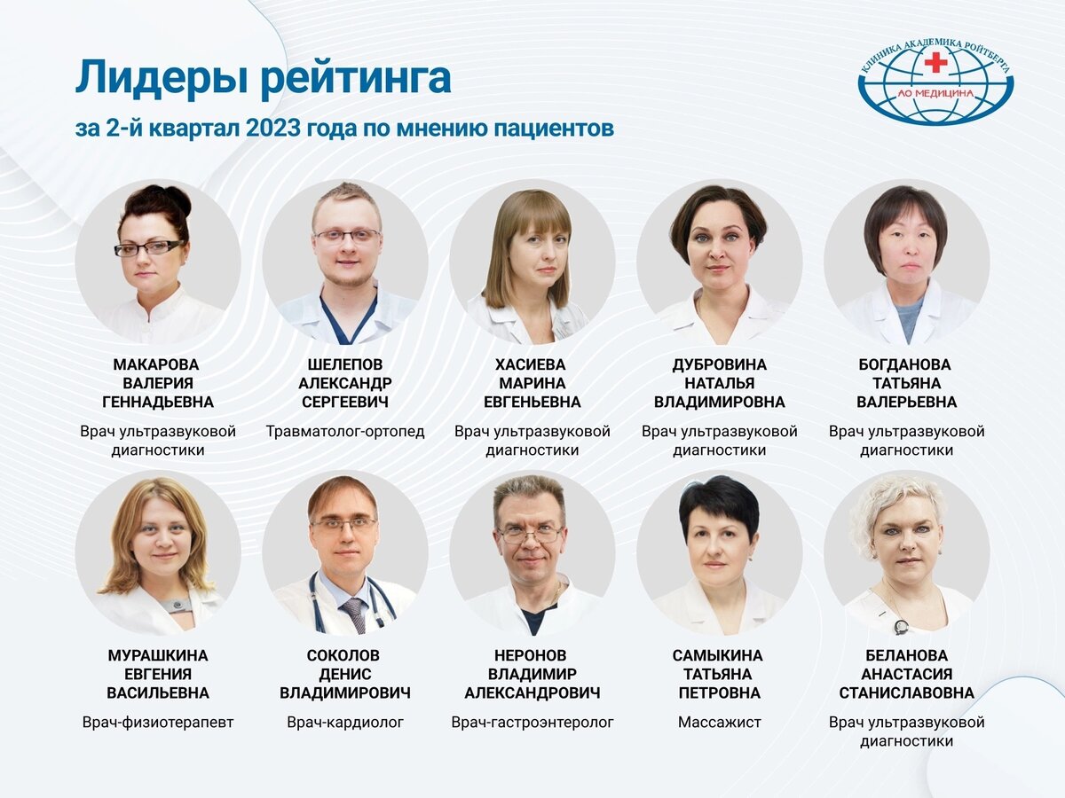 Раз в квартал мы составляем рейтинг лучших специалистов АО «Медицина» (клиника академика Ройтберга) на основе ваших отзывов и оценок.