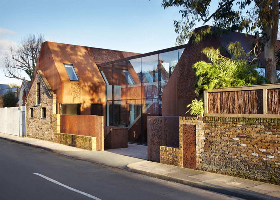 Современная частная архитектура Англии представлена разнообразными проектами, которые сочетают в себе традиционные и современные элементы. В архитектуре присутствует много направлений и стилей, удобство и функциональность, экологическая приспособленность и использование инновационных технологий. На нашем сайте собрано уже более двух сотен замечательных английских домов - здесь, на нашем Канале, мы постараемся познакомить наших читателей с самым интересным. Часть 14. Предыдущая часть здесь: 1. Реконструкция дома в Англии 2 Дом состоит из двух отдельностоящих блоков, соединённых друг с другом закрытым двухэтажным переходом, формирующим входную группу и небольшой внутренний дворик. Всего в доме два этажа и полноценный подвал,в котором расположена столярная мастерская хозяина дома. Дом сохранил часть исторического кирпичного фасада и забора. Добавленный к старому новый объём и дополнительный блок имеют традиционную двухскатную крышу и отделаны декоративной ржавой сталью (кортеном)... 👇 По