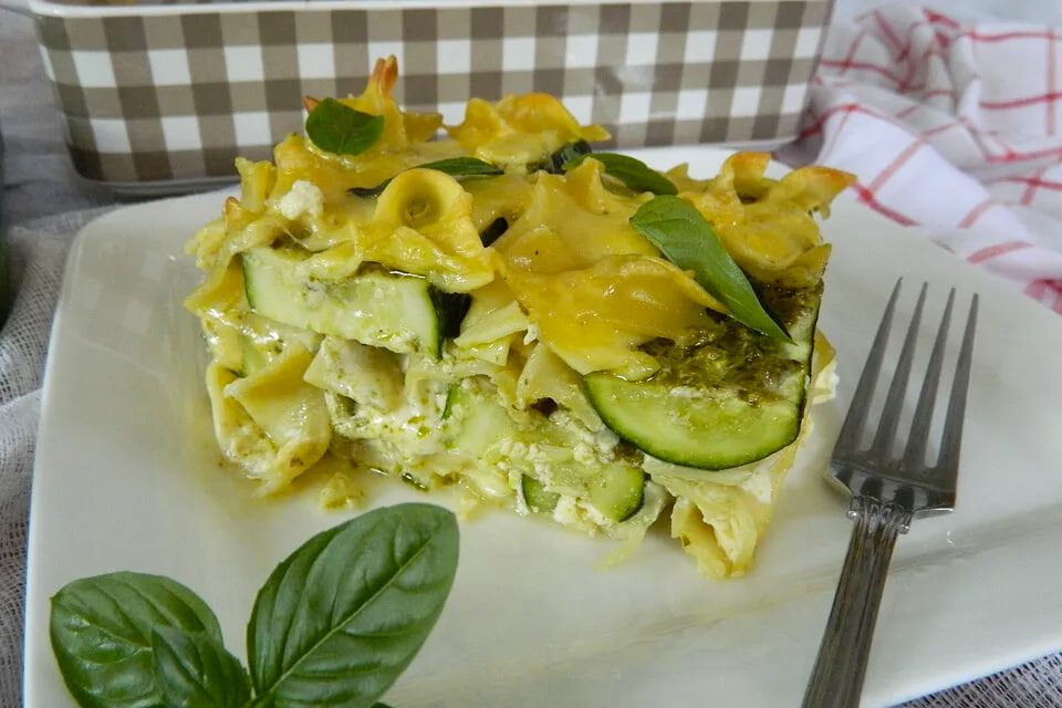 Выкладываем в форму для запекания слоями – слой лапши, слой цуккини. Заливаем смесью яйца с сыром. Посыпаем тертым твердым сыром и отправляем в духовку на 30-40 минут при температуре 200 градусов.