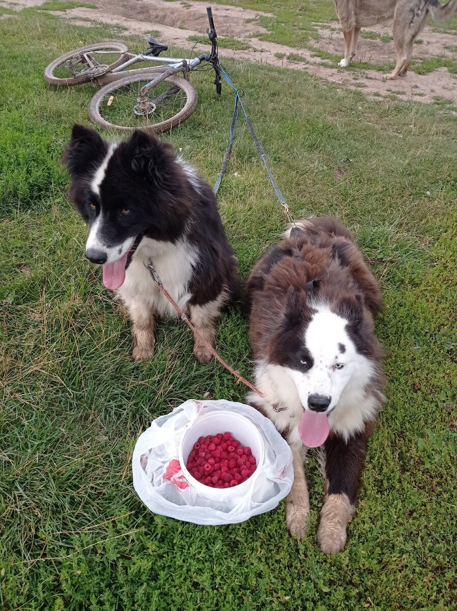 В этом году у меня катастрофически не складывается с поиском новых маршрутов для утренних тренировок с собаками, поэтому чаще всего мы ездим по одному и тому же – вокруг одной из окрестных деревень. И порой я останавливаюсь на ее окраине, если собакам нужен отдых. И как-то вдруг со мной поздоровалась жительница ближайшего дома, спросив, все ли у меня в порядке (велосипед лежит, я что-то делаю с собаками). Я поблагодарила за заботу и ответила, что да, с нами все хорошо, мы просто отдыхаем. Однако с той поры женщина стала часто здороваться со мной, а недавно я решила, что нам уже пора переходить на следующую «стадию» отношений, поэтому почему бы не познакомиться поближе? Хотя бы не узнать имена друг друга. И сегодня в честь знакомства я привезла ей вкусный чай. А она в ответ подарила мне целое ведерко своей малины! И кабачок в придачу. Так что я в очередной раз вернулась домой с «добычей». И с приятнейшим бонусом в виде нового знакомства. Вот что значит «правильные» тренировки! Подписыв