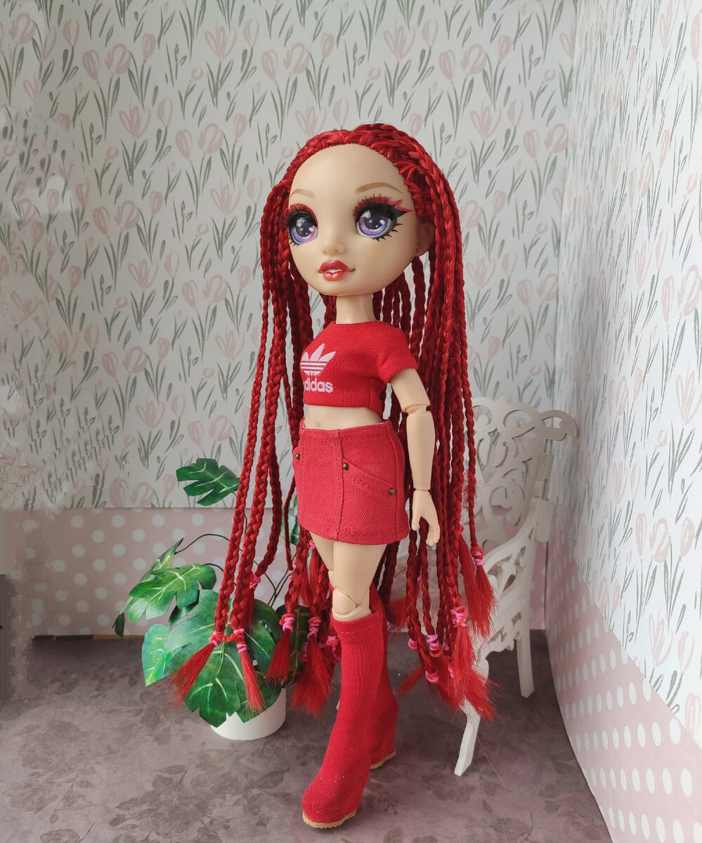 Приветствую всех любителей кукол, особенно Рейнбоу Хай. Решила я закончить образ Руби, а то стояла бедолага в одной майке, захотелось для полного образа джинсовую юбочку с не совсем привычными карманами и сапоги-чулки. Сшилось все довольно быстро, а вот сегодня решила заняться прической, я вообще не планировала плести косички, так парочку у висков и забрать их потом в хвост, но процесс как-то хорошо успокаивал, немного увлеклась, а когда заплела уже 1/4 головы - решила что проще доплести остальное, чем распускать эти. После 2,5 часов я медленно стала приходить в бешенство, причем бесил не сам процесс плетения, а совершенно лысая макушка, причем именно макушка, т.к. по кругу ниже волосы прошиты вполне прилично и густо Но чего уж теперь, в результате скрепя сердцем доплела эту лысую часть. В результате получилось 4 косичек, а я наловчилась плести косички толщиной даже 3 мм итак, обещанная выкройка, дана с припусками на швы примерно 3-4 мм, подгиб низа примерно 8 мм для тех, кто желает за