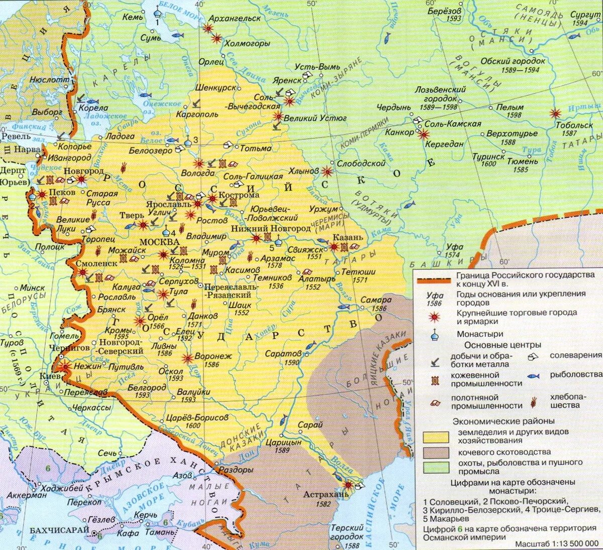 Образование единого Русского государства в XV—XVI вв. создало благоприятные условия для социально-экономического развития страны. В конце XVI в. на Руси проживало 7 000 000 человек. Население распределялось по огромной территории страны очень неравномерно. Более густо были заселены центральные районы, земли по берегам Волги от Твери до Нижнего Новгорода, Новгородско- Псковская земля и ее южные пятины. В районах Новгорода и Пскова проживало около 1 500 000 человек. В середине XVI в. здесь была самая высокая плотность населения — около 5 человек на 1 кв. км (в странах Запада она составляла в то время 10—30 человек на 1 кв. км). Не более 2 % населения жило в городах, которые тоже существенно отличались друг от друга численностью жителей. В начале XVI в. в России было 96 городов, в конце столетия —170, причем только в 16 из них насчитывалось более 500 посадских дворов. В Москве проживало около 100 000 человек, в Новгороде и Пскове — по 30 000, в Можайске — 8000, в Серпухове и Коломне — примерно по 3000 человек.