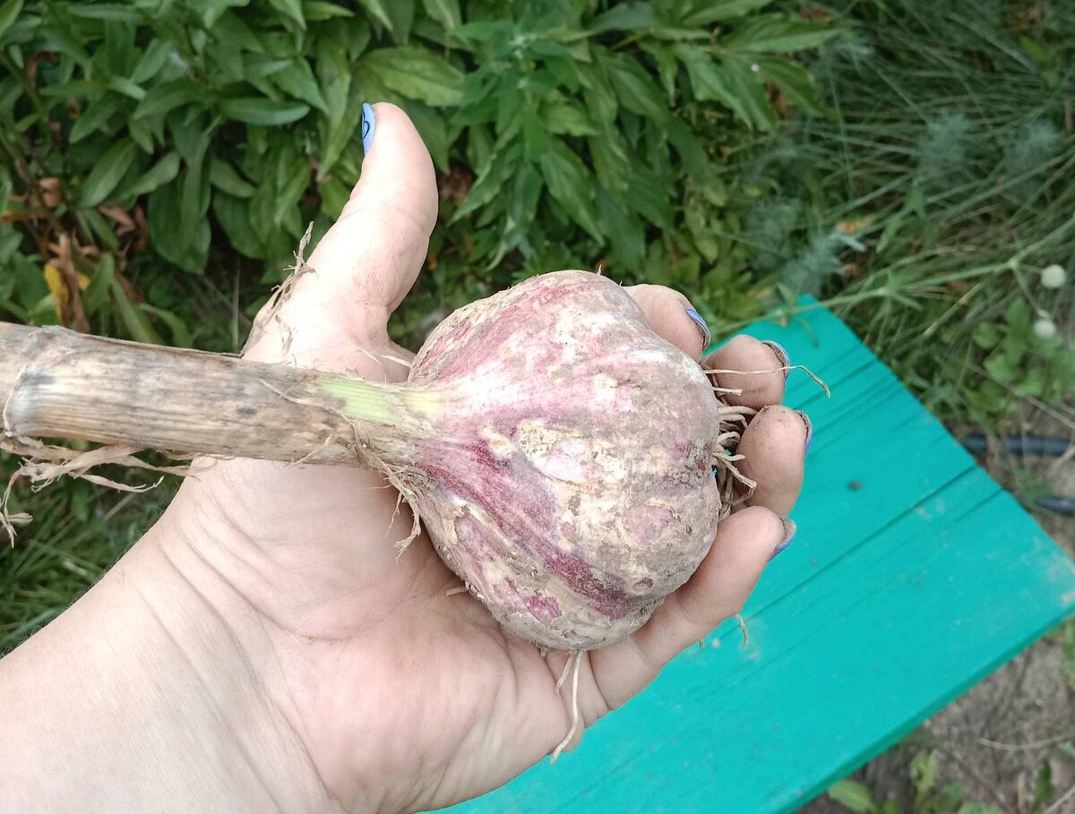 Выбрала чеснок, сижу и думаю - "чего ж тебе, зараза, не хватило?!" Сорт у меня хороший, при нормальных условиях головки вырастают с кулак. В этом году вот самая большая: Рассортировала на три кучки. Крупные головки, их больше всего: Средние: И немного мелочи, пойдет на закатки: Чесноку для урожая нужны три фактора: хороший сорт, питание и влага. С сортом порядок. Питания ему тоже должно было хватить: я вносила полное удобрение весной под перекопку, до появления стрелок подкормила два раза азотом, после того, ка появились стрелки - калийно-фосфорным удобрением. Значит дело в поливе. У нас в этом году почти два месяца дождей не было. Уже начали воду в 60-литровых бочках из озера возить. А поливать много чего надо было. И чеснок из этого много был не самым важным. Ну и выбрала я его немного поздновато. Это видно по "бороде" из корней. Если чеснок немного передержать, у него появляется вот такая пышная кисточка из корней. И он уходит немного глубже. Так что, урожай где-то на четверочку. К