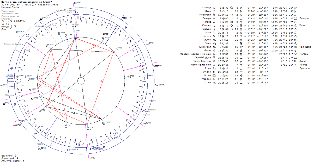 Но в хорарных техниках есть и другие варианты завершения дела, их перечисляет Клод Дарио. И некоторые значимые нюансы, отсутствующие у Дарио, можно найти у Бонатти. Так, по-моему, у Бонатти как раз и есть такое указание на успешное завершение дела, как трин или секстиль между Луной и Солнцем. Причем неважно, имеет Солнце отношение к I или VII дому или просто мимо проходило и ничего не обозначает. Вот тут как раз карта, которая не имеет других указателей на успешное завершение дела, кроме такого трина. А дело не может не кончиться успехом, потому что это же "Авито", там все время что-то продается. Просто не существует варианта, что там ничего не будет продано в рамках действия хорара (если не брать в расчет то, что человек по своей природе смертен, но тогда и пофигу уже, что там на "Авито" выставлено. Кстати, скорее всего, такой вариант обозначился бы в карте сожжением главного сигнификатора). Поэтому мы просто ищем любое указание, когда именно и при каких условиях, ибо варианты могут быть разными: когда ничего менять не надо и надо просто ждать, когда надо скинуть цену, когда надо вывесить что-то новое и т.д.